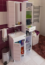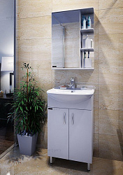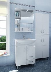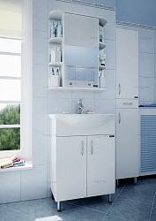 В просторных помещениях актуальнее использовать полноценный гарнитур и зеркала-шкафы для ванной «СанТа». В этом случае на дополнительных полках или ящиках разместятся банные принадлежности, косметика или запасные полотенца. Полочки для хранения закрываются матовым стеклом с узором, предусмотрена светодиодная подсветка.