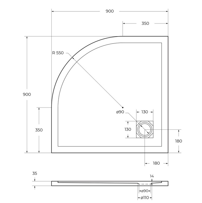 Душевой поддон из искусственного мрамора в комплекте с сифоном BelBagno UNO TRAY-MR-UNO-R-90-550-35-W-CR