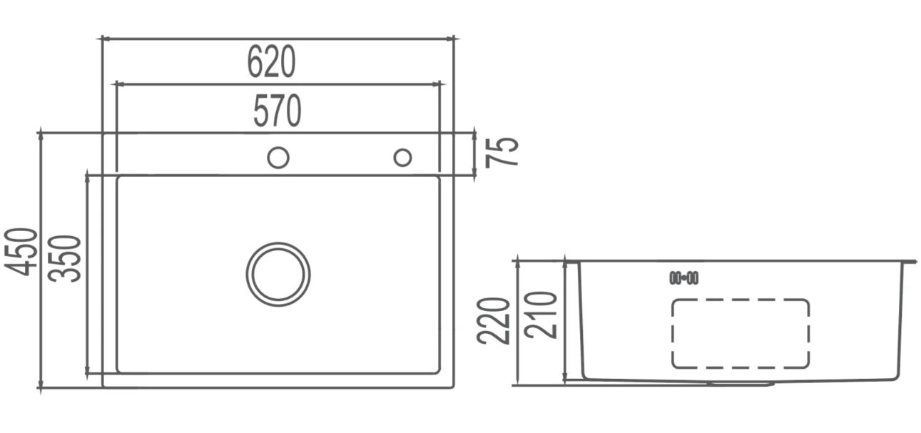 Кухонная раковина Arrow 620×450×220 мм, прямоугольная, с донным клапаном, нержавеющая сталь 0,7 мм