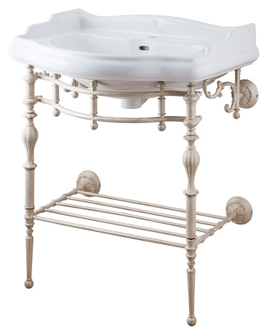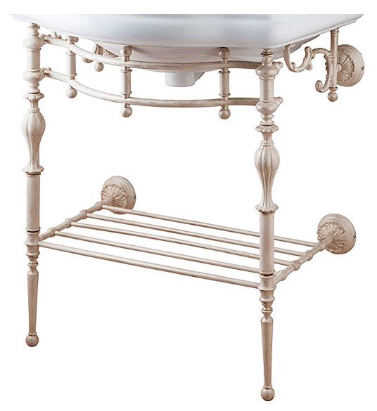 В ванной комнате можно установить не только тумбу для раковины, но и Консоль Caprigo 7060/73 белое золото. Конструкция из влагозащищенных материалов не имеет стенок. Она надежно поддерживает мойку, опираясь на устойчивые ножки. На дополнительных полках консоли можно хранить разнообразные предметы, косметические средства, салфетки. Такая мебель не загромождает пространство.