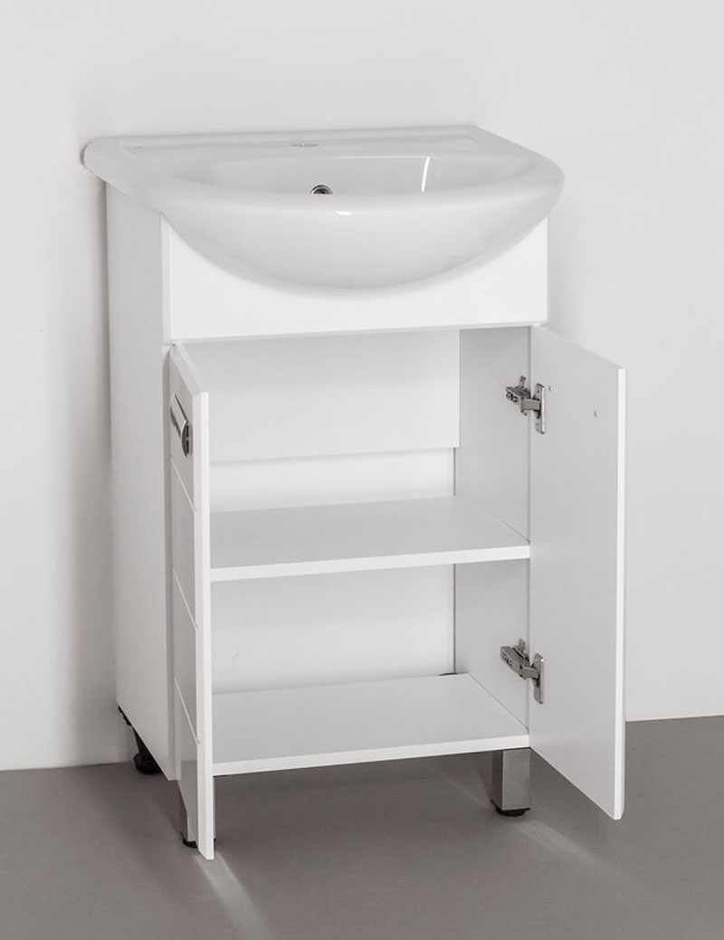 Напольная тумба Ирис 55 с раковиной Уют изготовлена в белом цвете, потому будет хорошо смотреться в большинстве современных ванных комнат. Мебель имеет две распашные дверцы на петлях с доводчиком и одну вкладную полку. Прямоугольные фасады декорированы врезными ручками с покрытием хром/матовый хром.