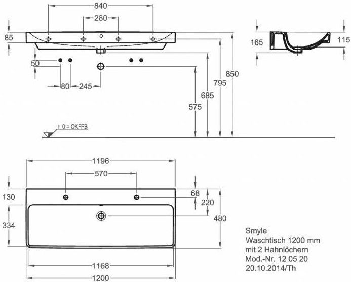 Smyle Square Раковина 120х48 см, 2 отв. под смеситель, с отв. перелива 500.253.01.1