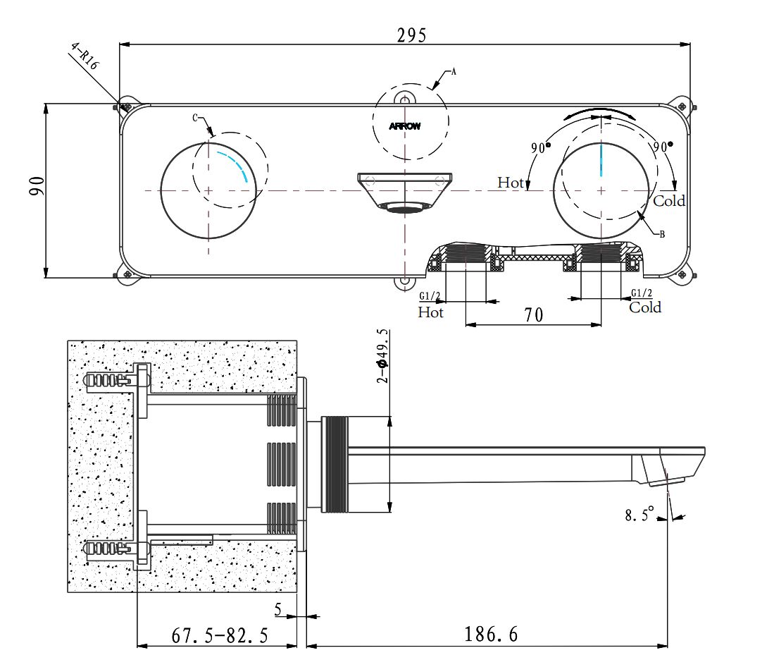 Смеситель для раковины ARROW ARM23872CP с внутренней частью, хром