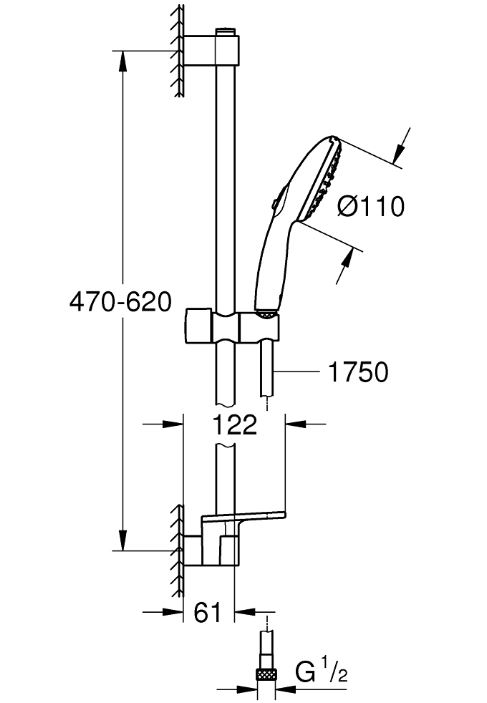Tempesta 110 Душевой гарнитур, 3 режима струи, душевая штанга 600 мм, шланг 1750 мм, полочка, 13,5 л/мин, хром 27927003