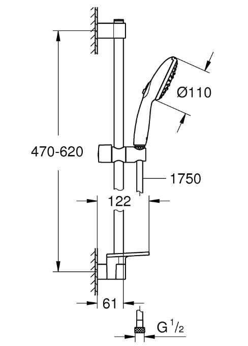 Tempesta 110 Душевой гарнитур, 3 режима струи, душевая штанга 600 мм, шланг 1750 мм, полочка, 13,5 л/мин, хром 27927003