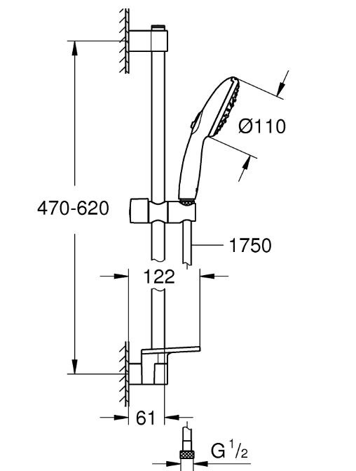 Tempesta 110 Душевой гарнитур, 3 режима струи, душевая штанга 600 мм, шланг 1750 мм, полочка, 13,5 л/мин, хром 27927003