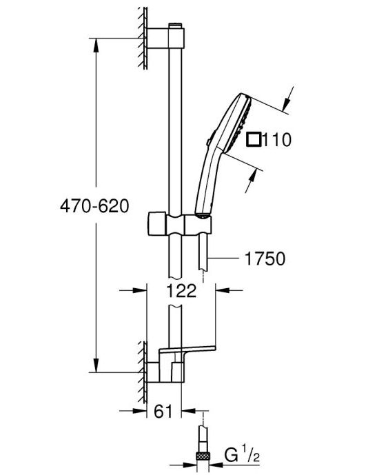 Tempesta Cube 110 Душевой гарнитур, 2 реж струи, душ штанга 600 мм, шланг 1750 мм, полочка, max расход 7,4 л/мин, хром 26907003