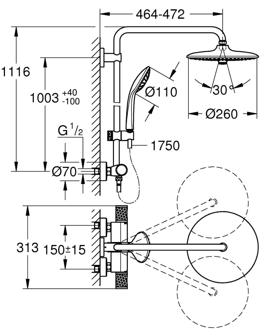 Euphoria 260 Душевая система поворотная с термостатом, душ III, кругл., хром 27296003