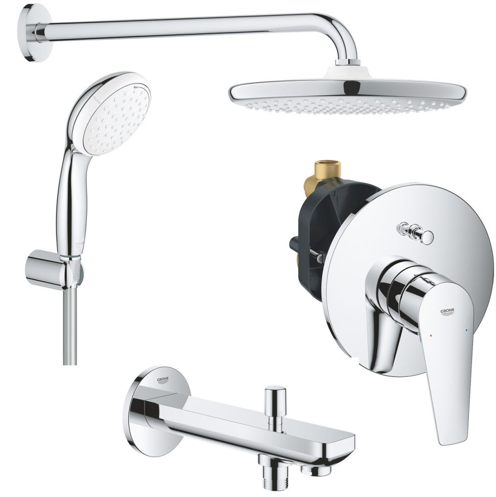 Набор GROHE Tempesta: верх душ 250 с душ кроншт 380 мм (26668000), смесит BauEdge (29079001), набор с руч душем, излив для ванны 170 мм, хром